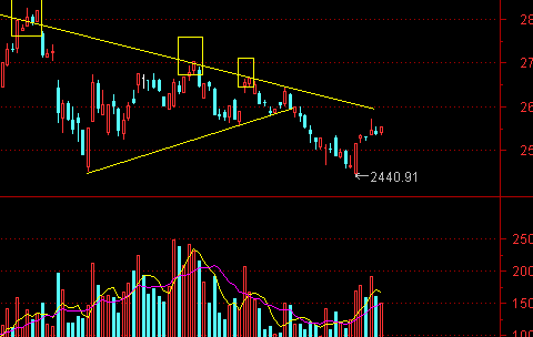 经过6天的反弹周期,指数逐步靠近了下降趋势线(27033--2666连线)的边缘,这个地方的压力不容小觑。如图: