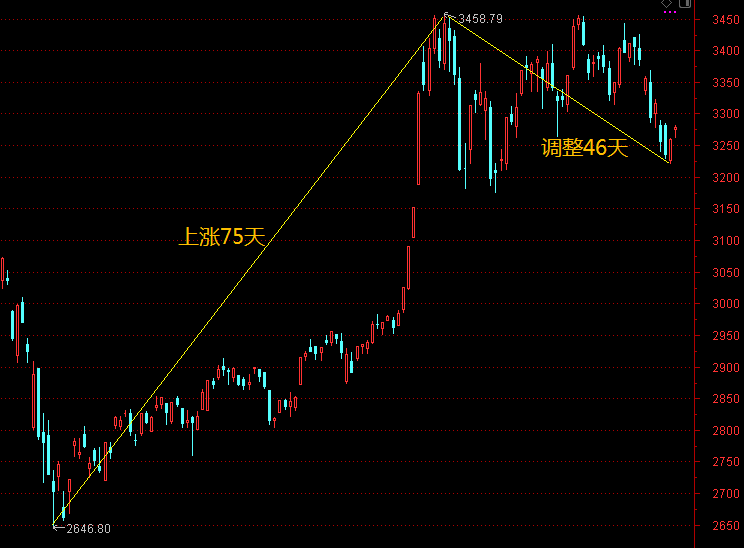 这波行情始于2644点,涨 了75天, 按照黄金分割0.618比率来算,需要跌46天。上周五正好是46天调整周期。