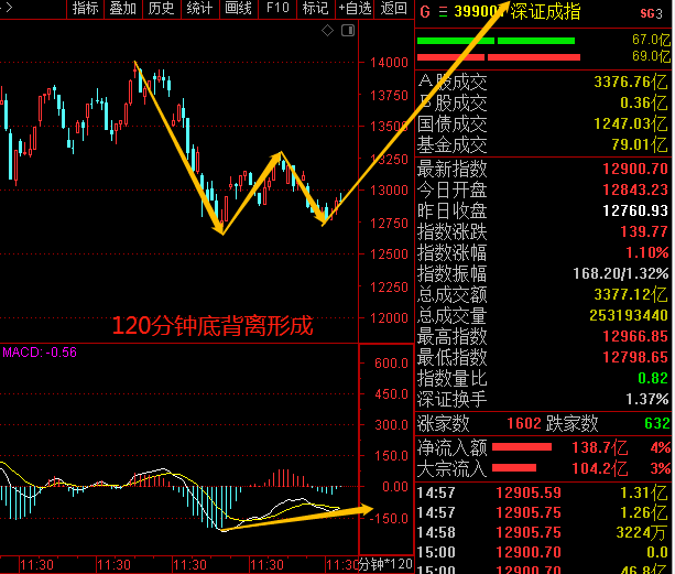 目前来看市场沪深中小创 全部出现了 日线+120F底背离走势, 技术面是杠杠的,同步出现意味着共振局面 ,这样的力度是很大的, 重点参考的深圳市场涨幅接近 400点,。这说明了虎子的技术可靠性。