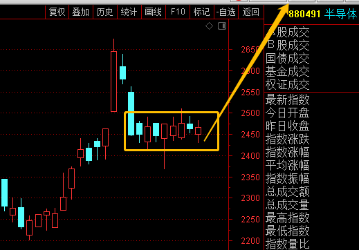 具体到板块, 券商板块今天表现亮眼, 国联证券涨停, 其他券商纷纷跟涨,其实仔细观察你会发现 券商板块最近一直在默默的吸筹, 低不下去,表现强于中小创, 和大盘同步。 另一个就是半导体, 半导体出现了大涨过后的横盘走势: