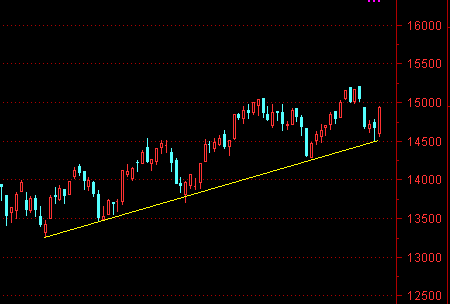 股市里没有100%,对于我们来说,要防止小概率,就是以深成指为准, 下轨线完美的支撑