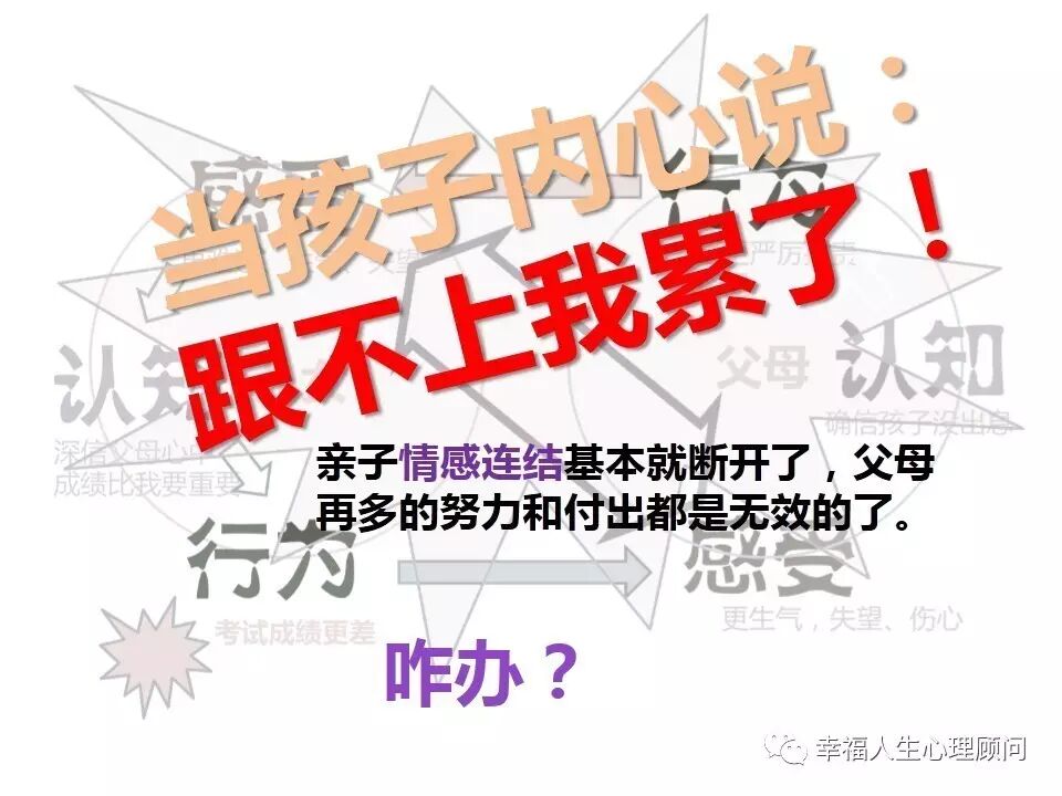 要知道,人的一切行为、感受、信念都是来自心中情绪的影响;任何关系中,没有健康的情感连结,最后都会演变成彼此间的伤害,因为情绪的需求未能满足,而索求情感的方式非但无效,反而造成了更深的伤害;一旦这个恶性循环造成,除非是了解到了问题形成的核心原因,是很难有机会解套的。