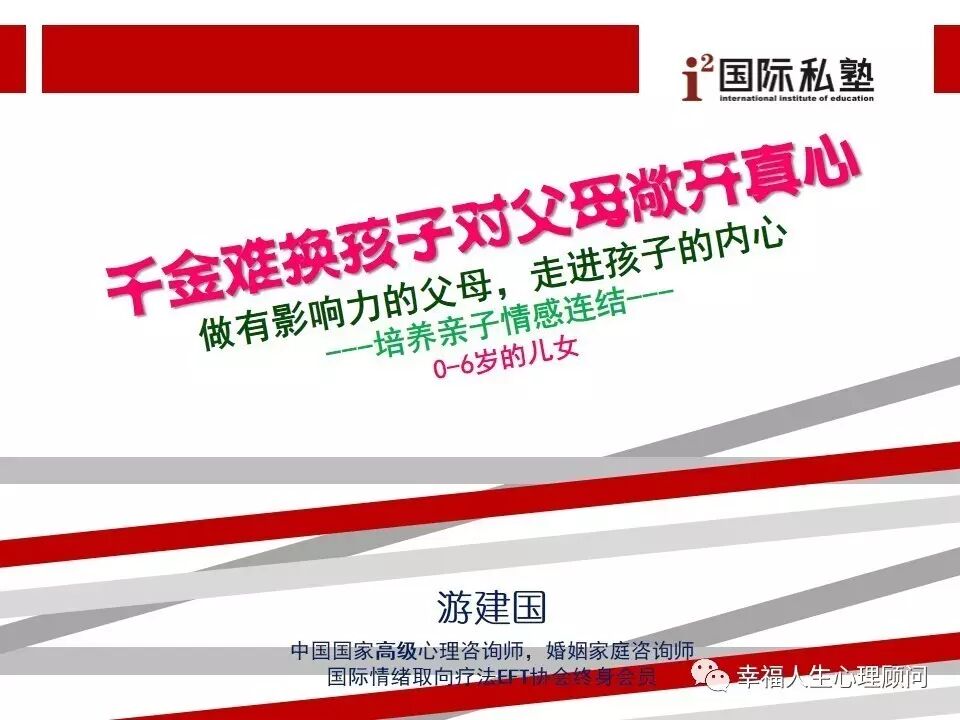 游建国老师主要针对亲子关系中情感连结的缺失,帮助父母看到它对儿女一生都有重要的影响,不仅让父母在教养孩子方面更加得心应手,更能成就父母与孩子之间终身的情感连结,让父母体验到自身的成长将会带给孩子及家庭的祝福。