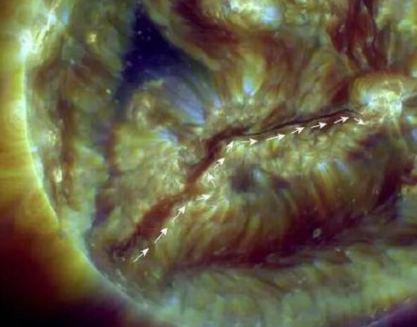 太阳活动最明显的影响就是对地球磁场的干扰。产生磁暴现象的话对电力、通讯、航空等方面都会产生不利影响。在两极也可能出现绚烂美丽的极光。这次出现的“暗线”无疑对地球磁场产生干扰,对人的情绪和疾病有推波助滥的作用。空间物理环境随着能量的波动经日地能量偶尔可能会影响我们的生理功能和疾病。