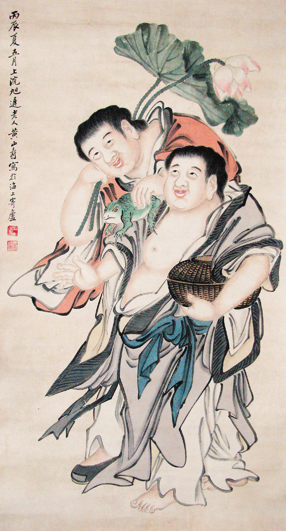 寓意:世人称“和合二仙”或“和合二圣”。“盒”与“合”、“和”同音,喻“和合”。民间嫁娶,喜挂和合像,取“和谐好合”之意,以图婚姻美满。和仙、合仙,是指高僧寒山和拾得。寒山,唐代僧人,相传他居丰县(今浙江天台)寒岩,喜吟诗饮酒,与天台国清寺僧人拾得为好友。在清代雍正十一年,寒山,拾得被封为和圣与合圣。