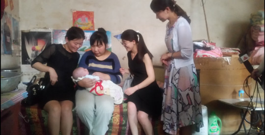 孩子的母亲杨晓青从孙雪娥和黑龙江红星集团推广部经理李朋姣两人手中接过了捐赠物品……