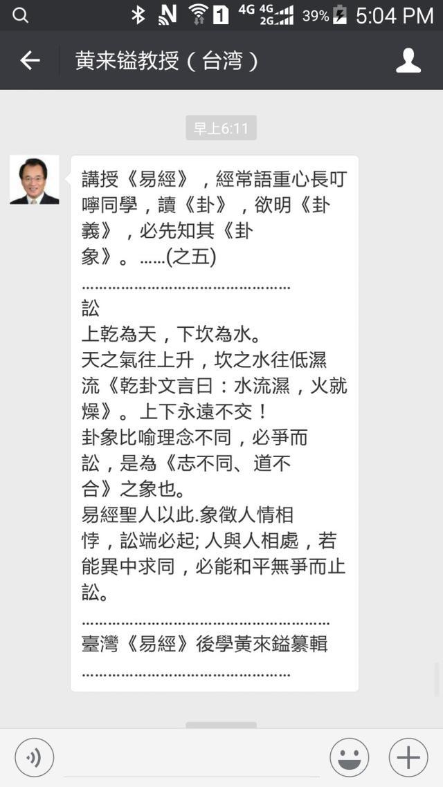 今天早晨,台湾教授黄来镒先生,分享过来的《易经》内容,以《周易》中的第5卦《讼》卦及如何“止讼”为主。