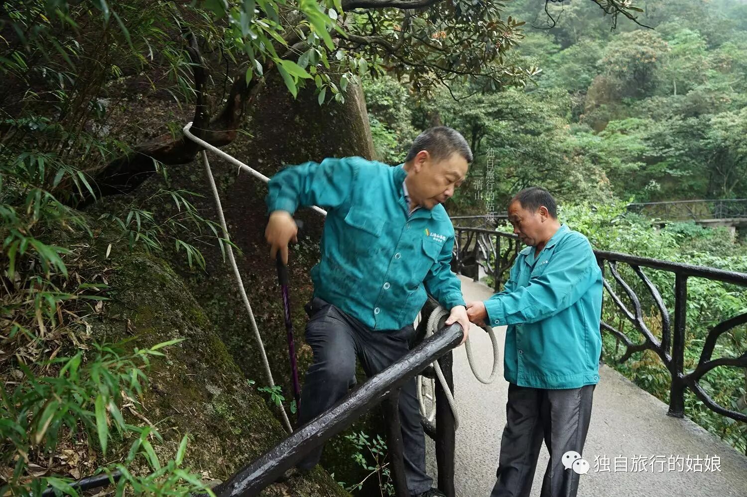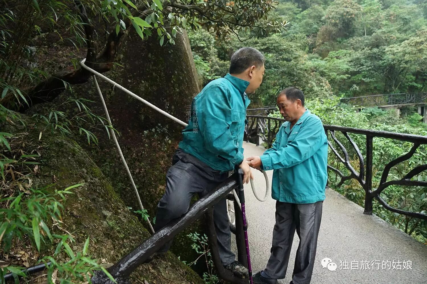 师傅说他一起的干活的在下面。我说在干嘛呢?他说平时都是捡垃圾,今天捡一个游客掉下去的东西!听到的时候,我很惊讶!这么危险,吊着一根绳子为了捡起垃圾!我去过不少地方,还真第一次遇到这样攀爬崖壁去捡垃圾的人!他说景区很多人会随手丢垃圾到山底下。这样很影响景区的美观,他们常年都在这里攀爬悬崖峭壁捡垃圾。