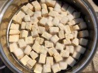 2.将老豆腐切成小块沥干水份,至少要一天一夜,取一能密封的容器,垫上稻草,将沥干水份的豆腐切成小方块,均匀地码在上面。
