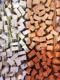 2.沥干水分后把豆腐切成小方块,摆放在竹蒸笼里,要每块之间空出间隙好让豆腐充分发酵。
