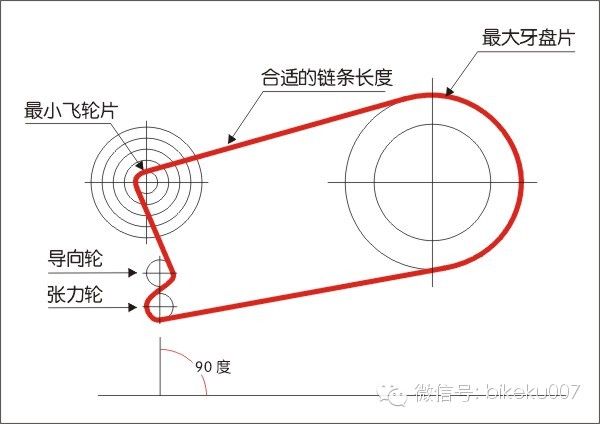 2、将链条挂在大盘和小飞上,拉紧链条后使后拨导臂与水平呈90°角;