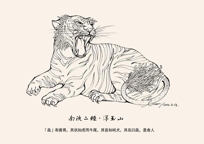 再往东五百里,是座浮玉山,在山上向北可以望见具区泽,向东可以望见诸(音批)水,山中有一种野兽,形状像老虎却长着牛的尾巴,发出的叫声如同狗叫,名称是彘(zhì),是能吃人的。苕(tiáo)水从这座山的北麓发源,向北流入具区泽。它里面生长着很多鮆(cǐ)鱼。(很多章节因为简单不注释也能一眼看明白文意的。)