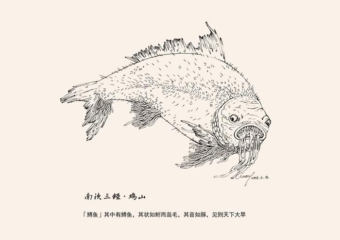 又东五百里,曰鸡山,其上多金,其下多丹雘(huò)①。黑水出焉,而南流注于海。其中有鱄(tuán)鱼②,其状如鲋(fù)③而彘(zhì)④毛,其音如豚(tún)⑤,见则天下大旱。