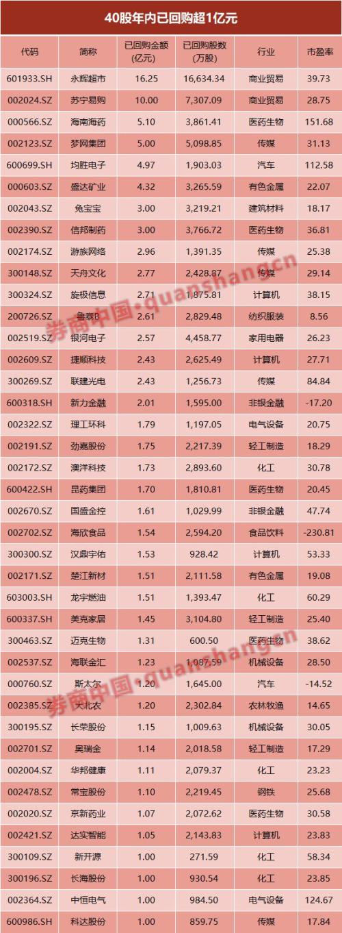 谁是回购弄潮儿:40家公司回购金额过亿元