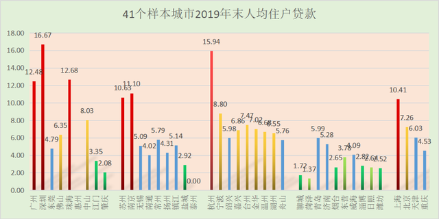 3)17个城市人均住户贷款在5-10万元范围。比如浙江的宁波、台州、金华、嘉兴、温州、湖州、绍兴和舟山,广东的中山、 佛山,江苏的常州、 镇江和无锡,山东的青岛与济南,以及京津两个直辖市;