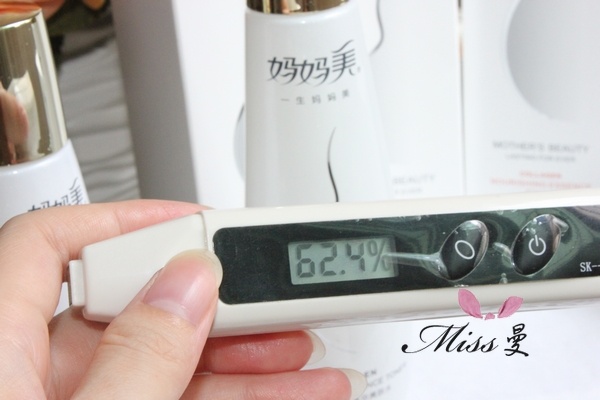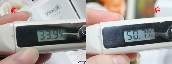 经过妈妈美的四重护理后,脸上的肌肤含水量由最初的30%提升至了62.4%