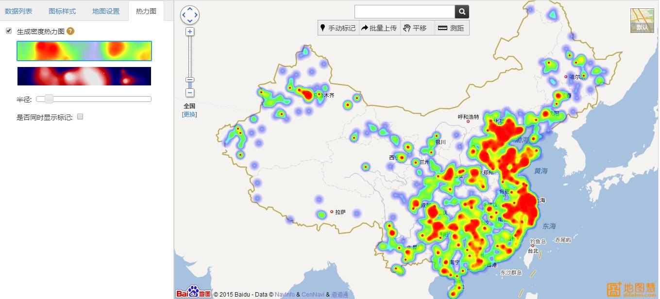 切换到热力图标签,勾选“生成密度热力图”,高大上的效果立马就出来了,有木有?还可以根据喜好选择热力图的颜色及半径。太方便了!