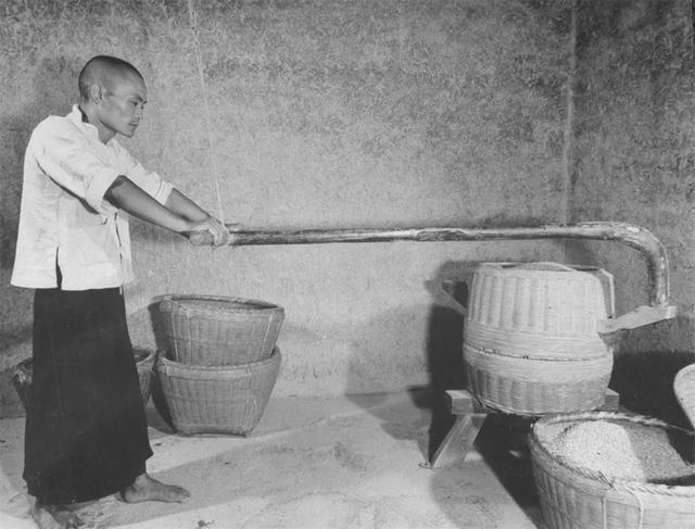 那时候没有碾米机,用石磨磨面是最常见的方式。这户人家还用箩筐罩住石磨,算是非常讲卫生的了。