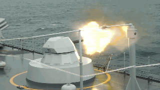 长沙舰与海口舰相互为“敌”进行模拟攻击。随舰记者拍下了长沙舰130mm主炮击中漂浮靶的精彩瞬间。