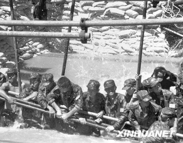 原南京军区某部红军团战士在长江大堤决口处用人堤堵住决口。