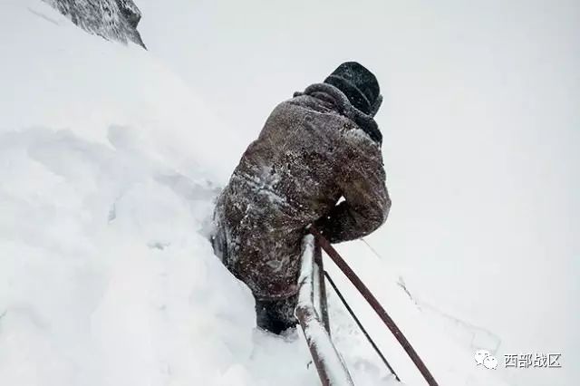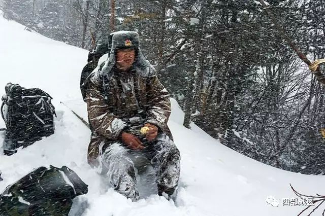 在詹娘舍哨所已服役8年的班长马关敬在前面凭着经验带路。由于风雪太大,四人的防寒面罩都已全部结冰。途中四人就用压缩干粮充饥,补充体力。而这一组照片正是哨长李玉成在归途的前半段所拍,后半段由于风雪太大,体力透支严重,已无暇拍摄。