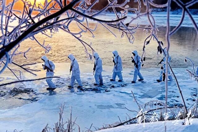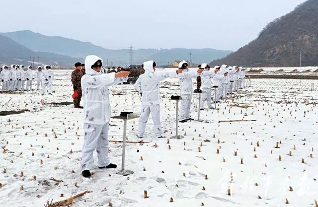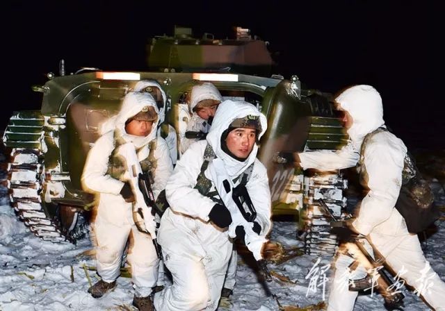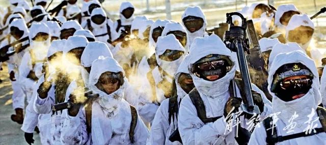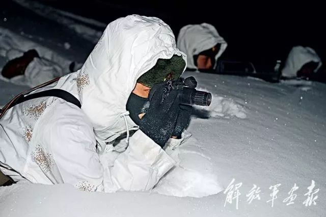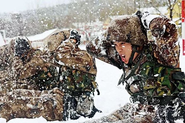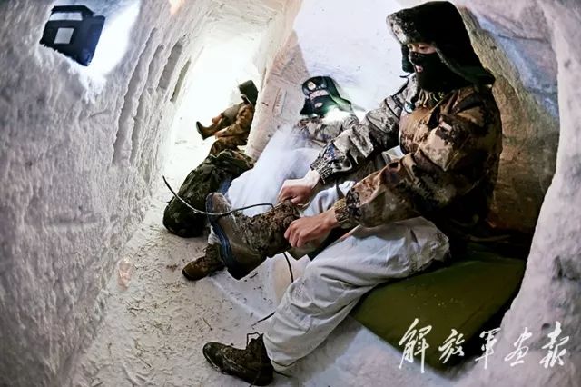 陆军某集团军某特战旅官兵在雪窝棚里听到集合哨声,立即穿戴整齐,准备出发。