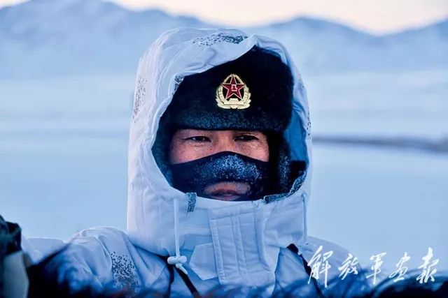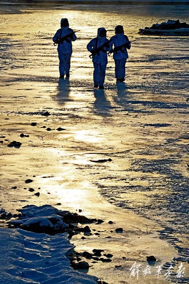 某边防团四连官兵冒着严寒在冰面上巡逻执勤。