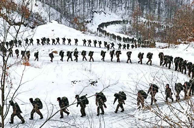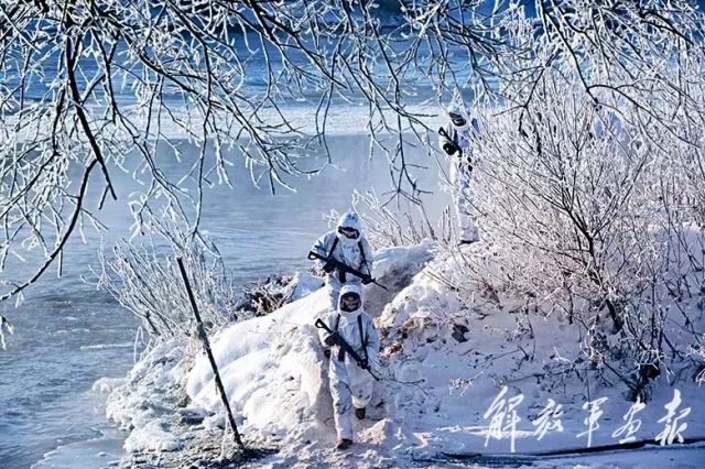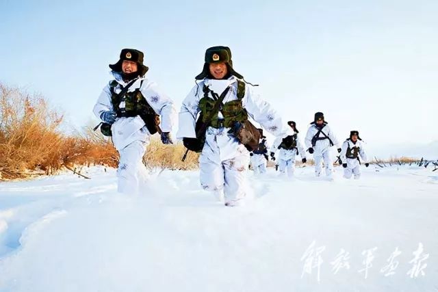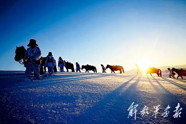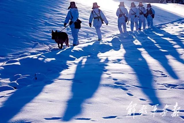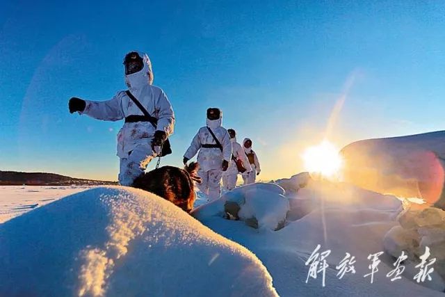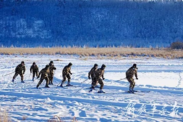 驻漠河某边防团官兵踏雪巡逻,守护祖国的边防线。