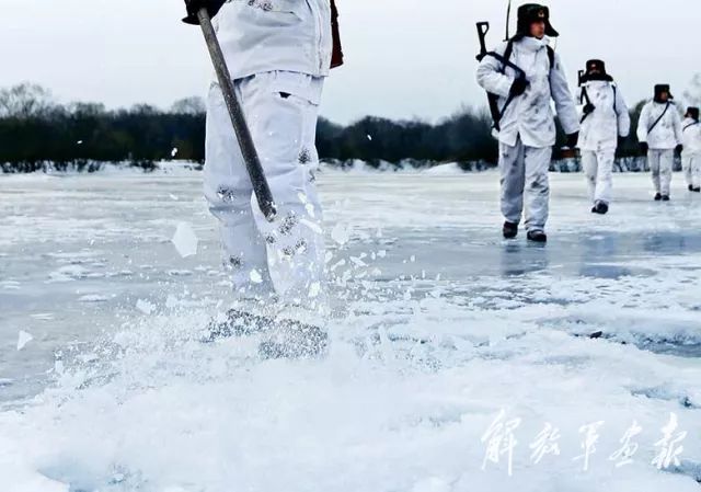 某边防团四连官兵严格按科学规范试探冰层承重状况,确保巡逻途中安全。