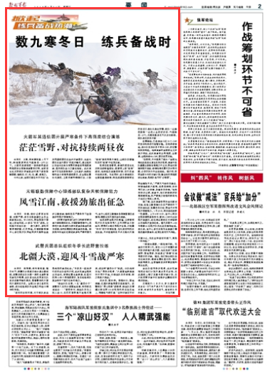 数九寒冬日,火箭军某通信团开展严寒条件下高强度综合演练;无锡联勤保障中心锤炼部队复杂天候保障能力;武警兵团总队组织冬季长途野营拉练。请关注今日出版的《解放军报》的详细报道——