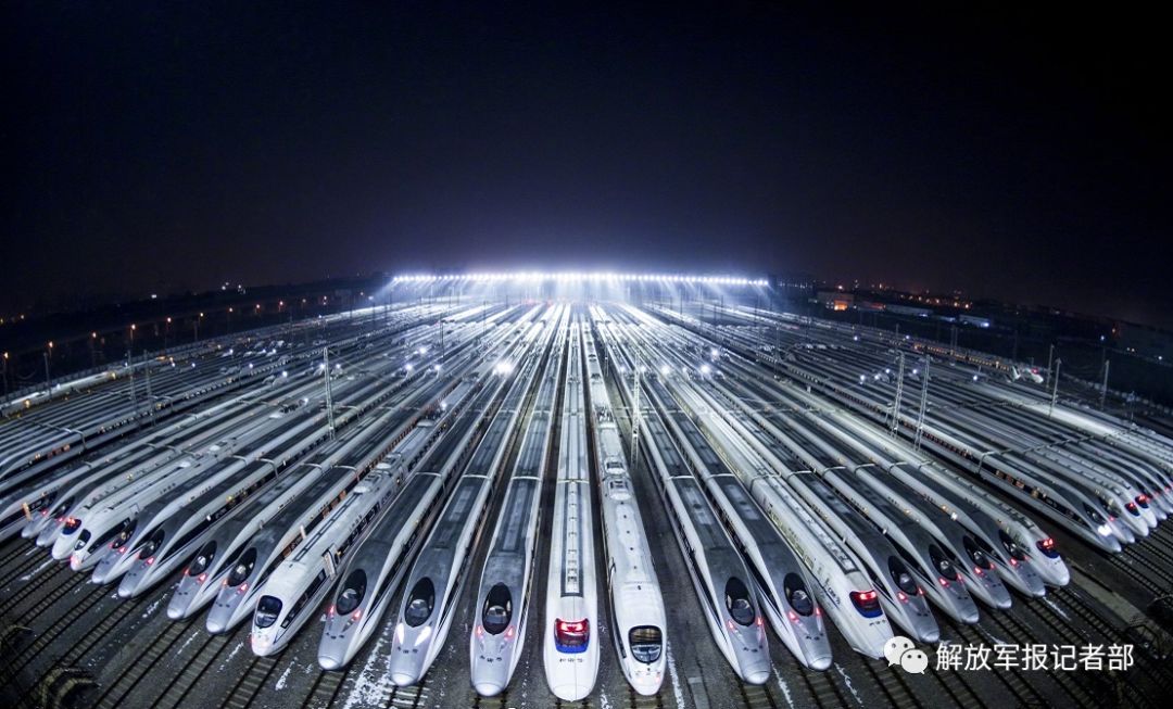 春运首日,近百组在武汉动车段经过检修、保温作业的动车蓄势待发,迎接春运。(新华社)