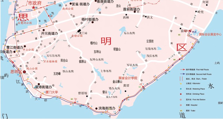 从国际会展中心起跑→环岛路→民族路→中山路→思明北路→湖滨南路→湖滨中路→湖滨北路东段(七星路路口)(终点)