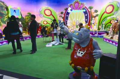 在大拇哥展位入口两侧,分别摆放着动画形象小瑞和大魔王的模型,另有4个大号卡通人偶在展位前慢悠悠地走来走去,引得路过的观众驻足留影。而对面的小玩皮展位则在门口设置了一个名为“大力士挑战赛,iPad mini等你赢”的游戏,吸引不少年轻男士举“锤”狂砸,展厅内的4台壁挂电视播放着动画片《小玩皮》,旁边展牌上称其为“童装业首部3D动画巨作,引领动漫营销新浪潮”。据了解,该片共4季104集,每季26集,每集13分钟,目前第一季已经在央视等媒体播出,第二季正在制作中。