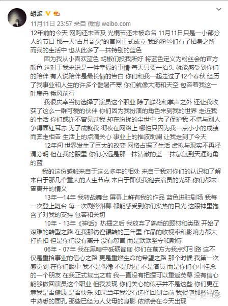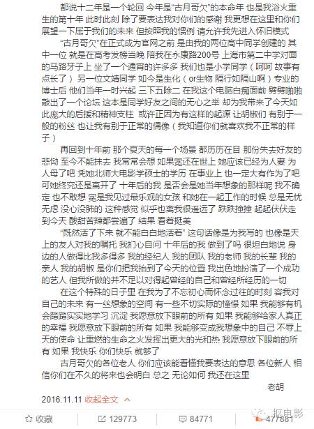 在这篇长文里,老胡追忆了官方粉丝会“古月哥欠”的成立,这些年来的扶持和陪伴,还缅怀了十年前那场车祸里离世的助理。