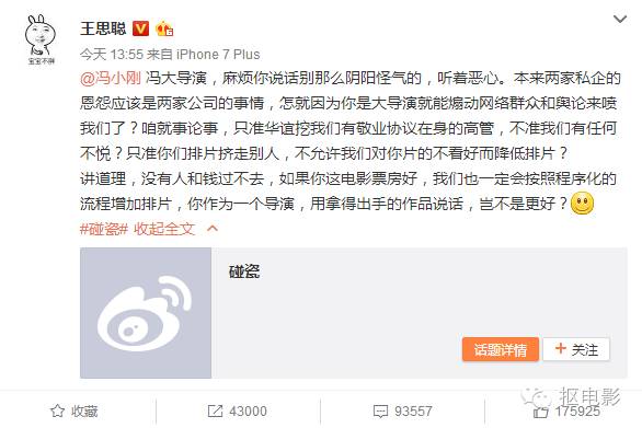正中午时候,冯小刚发微博预告,说12:30要给万达老总王健林发一份公开信。