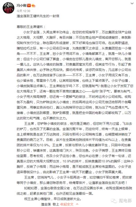 冯导的电影《潘金莲》上映,万达因为之前华谊挖角的私人恩怨,所以故意压低了《潘金莲》的排片,所以冯导不高兴了。