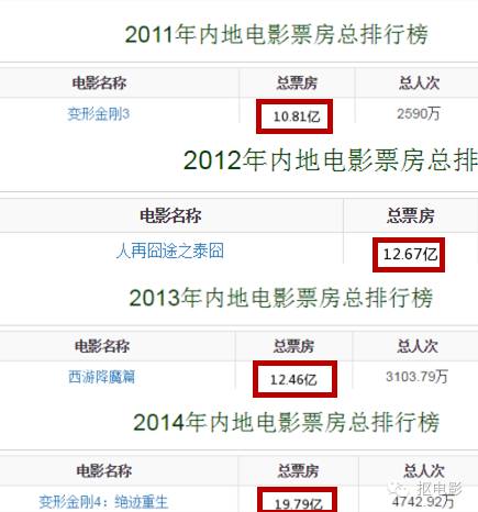 在这之前,2010年到2014年的票房冠军,都仅仅是10亿 ;而2009年之前,则5亿都不到。