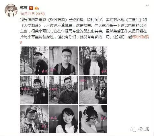 10月份,韩寒发了一条微博,说自己的新电影《乘风破浪》已经拍摄一段时间了。