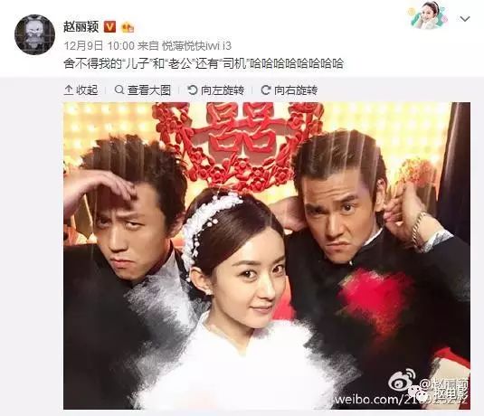 但赵丽颖日前杀青的时候在微博晒过剧照,照片上,颖宝身穿白色裙子头戴白纱,背后一个大红“囍”字,邓超、彭于晏陪在左右,她还配文:舍不得我的“儿子”和“老公”还有“司机”。