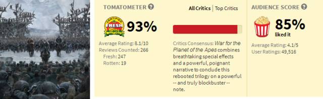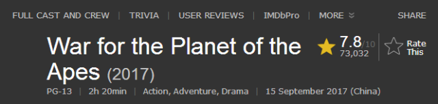 三部曲的电影数不胜数,但是能有三部口碑都不错,而且收官之作能赶超前者的,还真的挑不出几个来。即便《教父》和《星战》,到了第三部也都见仁见智。但《猩球崛起》系列却做到了。