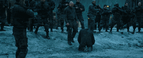 这一刻精神和心理上的挣扎让他已经不再是一个猿类,因为这本身就已经超出了动物行为的范畴,凯撒真正成为了一个有思想有判断能力的高等生灵。最后以凯撒这样的个体反映出了一代猿族的文明。