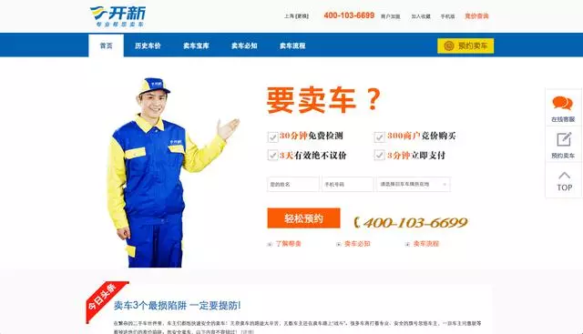 开新帮卖是一个二手车 C2B 平台,解决的是二手车市场存在地区差价和信息不对称的问题。通过开新,C端车主可以直接把车卖给经销商或异地,交易完成之后,开新向商户收取佣金。车主通过电话或网站向开新提交卖车需求之后,可以就近到开新门店或者开新的检测师会上门对车辆进行检测。整个过程会在 30分钟内完成。检测结果可以即时上传到竞拍中心进行竞拍发布。经销商对中意车辆出价竞拍,价高者得。开新的模式是交易所模式,为二手车的交易定标准,定价格,提供交易保障。开新不做交易对手,不是买卖双方的任何一方,是第三方。