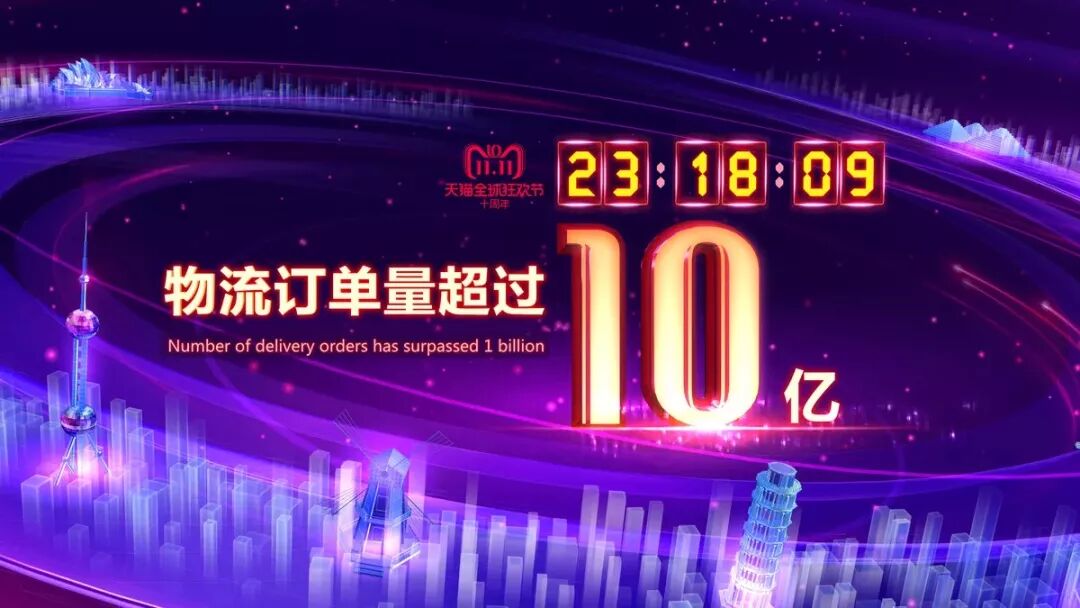 今年天猫双11又创多项纪录。2018年11月11日23小时18分钟09秒,天猫双11物流订单超过10亿,全天达10.42亿个。十年双11,包裹数强劲飙升4000多倍,这是一个历史性的跨越,宣告中国快递进入一天10亿的新时代。