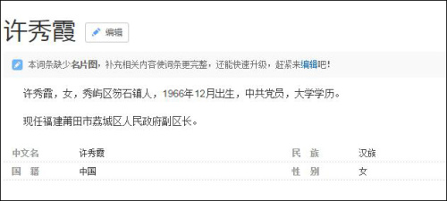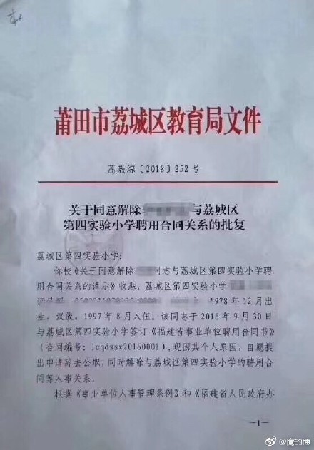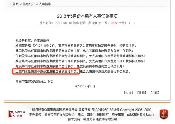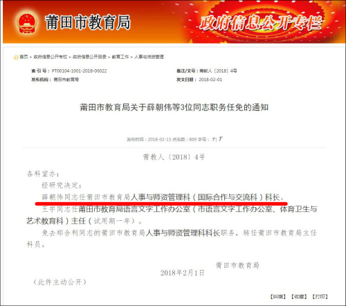 莆田市教育局师资与人力科科长薛朝伟是她的表姐夫。查询莆田市教育局网站的任免公示消息可以看到,一位名叫薛朝伟的人在2018年2月被任命为了莆田市教育局人事与师资管理科(国际合作与交流科)科长。