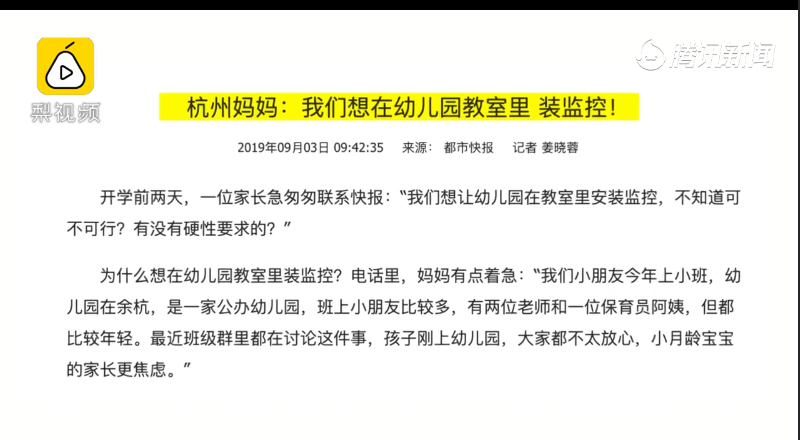 9月3日,杭州有位妈妈在开学之际提出诉求,希望自己能实时查看幼儿园的监控,看到孩子的状态。园方回复,家长实时查看监控是不被允许的,希望给老师多一点信任,也保护好孩子和老师的隐私。