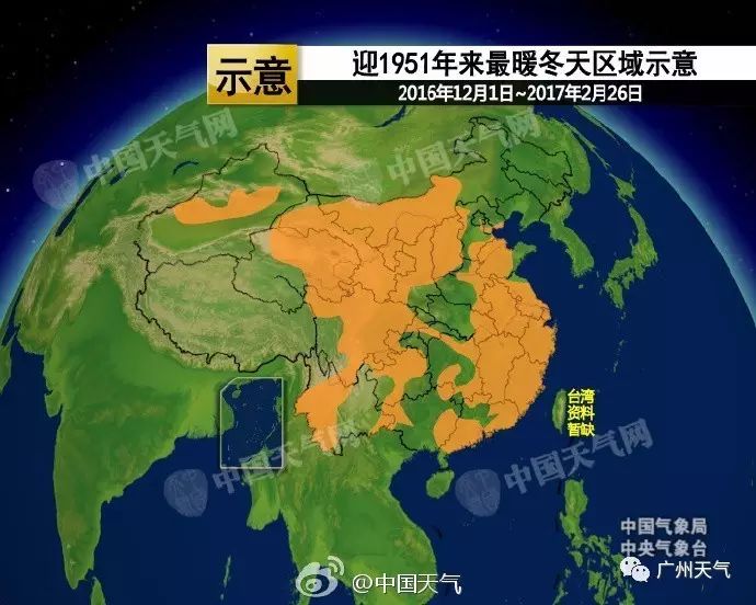 中国天气网公布:对下图中橙色的区域来说,这个冬天是1951年以来最暖的!(广州华丽丽在橙色里。)