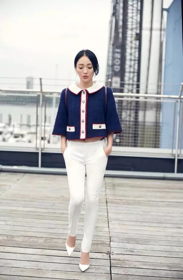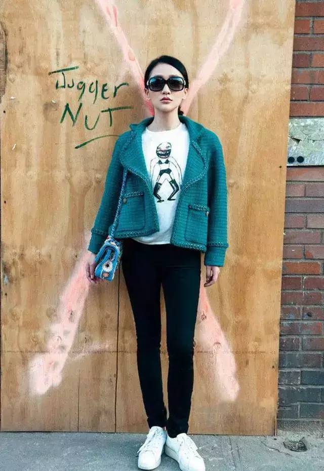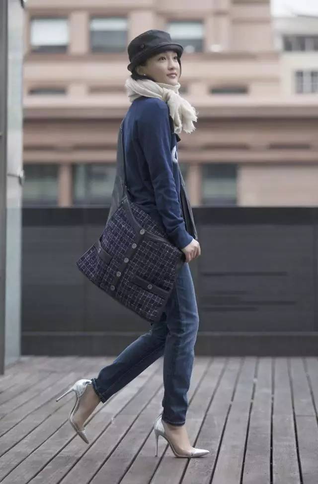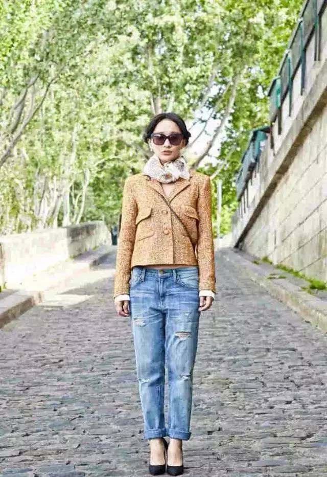 周迅精灵又小女人的特质特别适合粗呢花短款, 搭配宽松牛仔裤 ,脚踩裸色高跟鞋,非常显高显腿长。