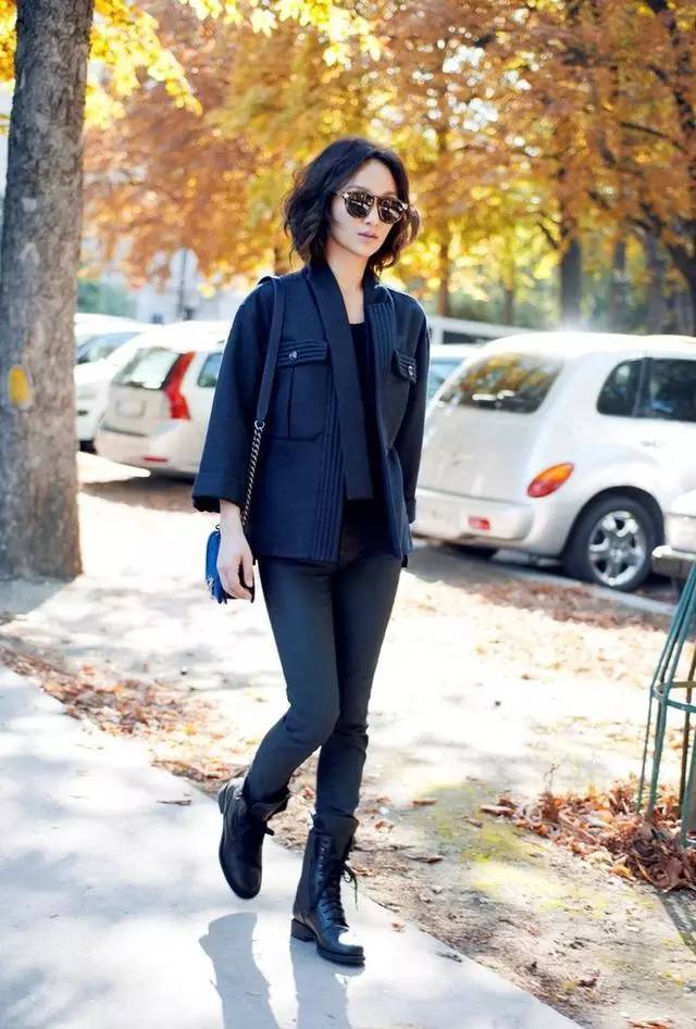 深蓝色的外套搭配宝蓝色的丝绒小背包,尽显高贵气质,大号的外套与靴子可以让腿显得更细更长,墨镜与机车短靴上下呼应增添酷感。