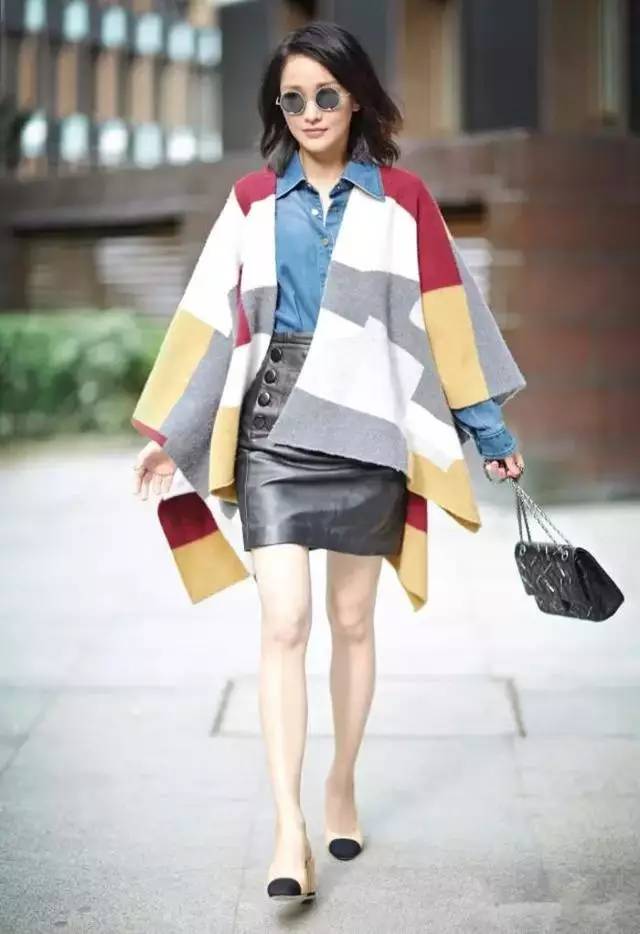 周迅披肩的围巾很有潮味,内搭皮裙,性感又时髦。