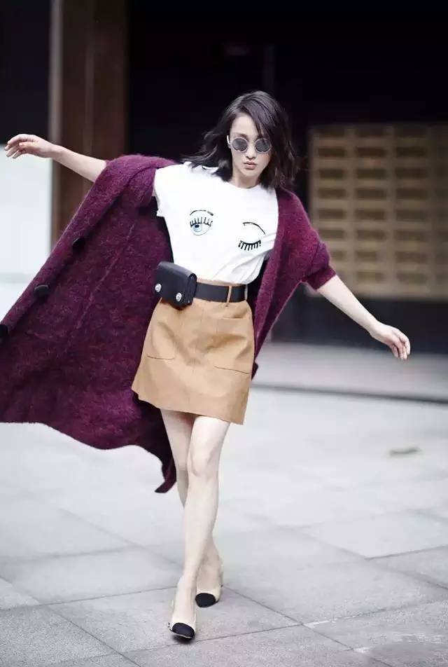 眼睛印花T恤搭配今年大热的麝皮裙,穿长款开衫,也能穿的大气场哦。
